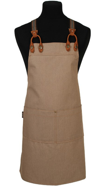 Denim bretelschort met verstelbare medium X-bretel voor een perfecte pasvorm. Voorzien van een mooie, afneembare handdoeklus voor extra gemak.