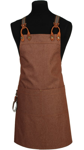 Denim bretelschort met verstelbare extra lange X-bretel voor de ideale pasvorm. Voorzien van een mooie, afneembare handdoeklus voor extra gemak.