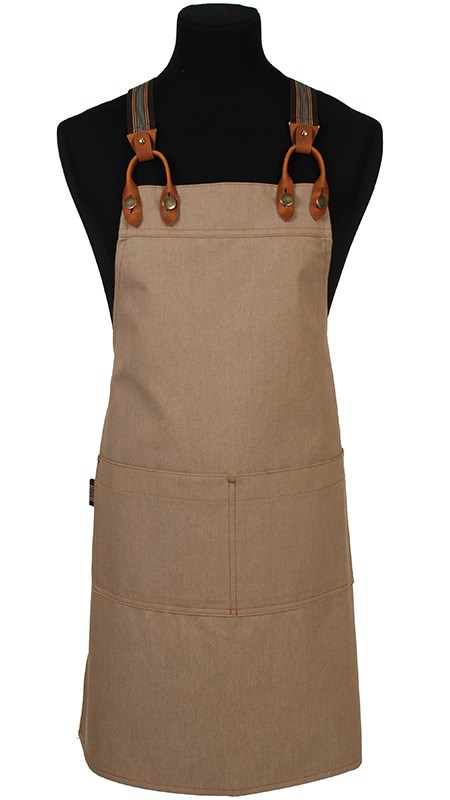 Denim bretelschort met verstelbare extra lange X-bretel voor de ideale pasvorm. Voorzien van een mooie, afneembare handdoeklus voor extra gemak.