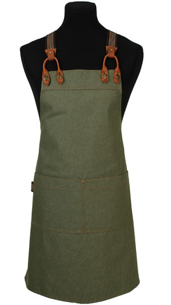 Denim bretelschort met verstelbare extra lange X-bretel voor de ideale pasvorm. Voorzien van een mooie, afneembare handdoeklus voor extra gemak.