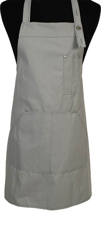 Denim halterschort, kleurvast en industrieel wasbaar. Voorzien van een verstelbare nekband, een dubbel opgestikte steekzak in twee delen met rivetten voor extra stevigheid, en een handig pennenzakje voor duurzaam en praktisch gebruik.