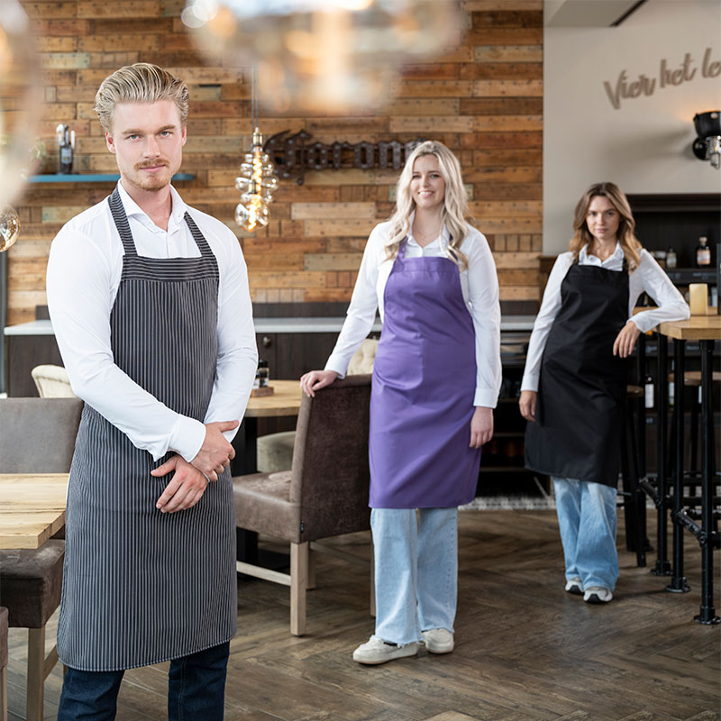 Onze halterschort zonder zak, verkrijgbaar in een scala aan kleuren, inclusief smalle krijtstreep. Praktisch, stijlvol en makkelijk in onderhoud.