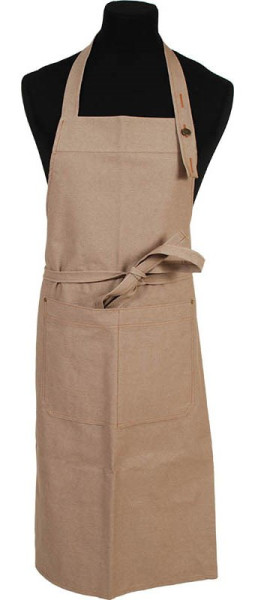Denim halterschort, kleurvast en industrieel wasbaar. Voorzien van een verstelbare nekband, een dubbel opgestikte zak in twee delen extra verstevigd met rivetten, en lange strikbanden voor een perfecte pasvorm.