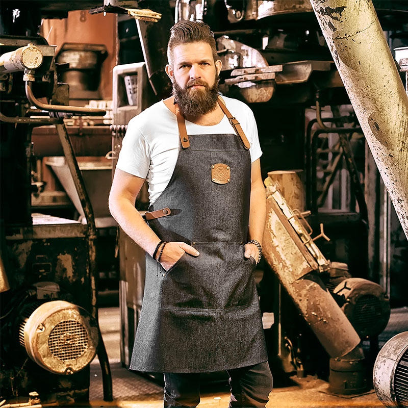 Denim halterschort, kleurvast en voorzien van afneembare, te personaliseren badge. De leren riemen, gespen en badge zijn afneembaar voor eenvoudig uitwassen. Met verstelbare nekband inclusief stoffen bescherming en dubbel opgestikte steekzakken met rivetten voor extra stevigheid.