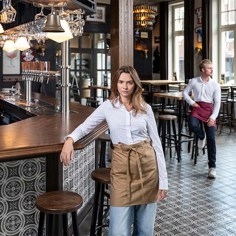 Belgische sloof met grote dubbel opgestikte zak in twee delen, ideaal voor handhelds of pinapparaten. Kan zowel aan de voor- als achterzijde worden geknoopt.